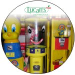 Distributore interattivo di palline. Vasca superiore per diametro 65mm, vasca inferiore per diametro 50mm.Gettoniera da 1,00Inserita la moneta nella gettoniera, l'utente sceglie...